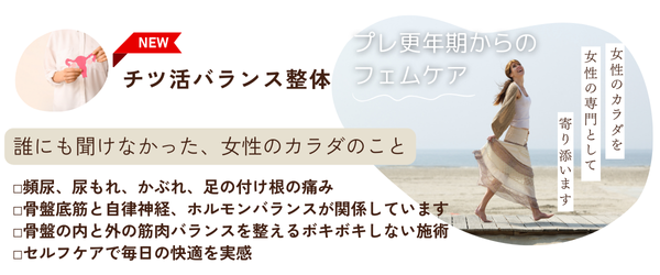 新メニュー「チツ活バランス整体」を中心に、骨盤底筋と自律神経にアプローチ。ボキボキしない優しい手技で、ホルモンバランスの変化(プレ更年期〜アフター更年期)に揺らぐカラダを芯から整えます。